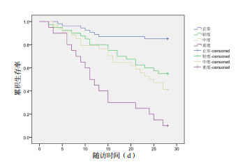 2.3 ACP值与预后正常组28 d病死率为14.81%(8/54),轻度心功能损害组28 d病死率为44.00%(18/40),中度心功能损害组28 d病死率为58.82%(20/34),重度心功能损害组28 d病死率为90.00%(18/20); 正常组与轻度损害组比较,差异有统计学意义(χ2=10.46,P<0.01),正常组与中度损害组比较,差异有统计学意义(χ2=18.63,P<0.01),轻度损害组与中度损害组比较,差异无统计学意义(χ2=1.41,P>0.05),轻度损害组与重度损害组比较,差异有统计学意义(χ2=11.25,P<0.01),中度损害组与重度损害组比较,差异有统计学意义(χ2=5.87,P<0.05)见表 2。4组患者累计生存曲线见图 1。