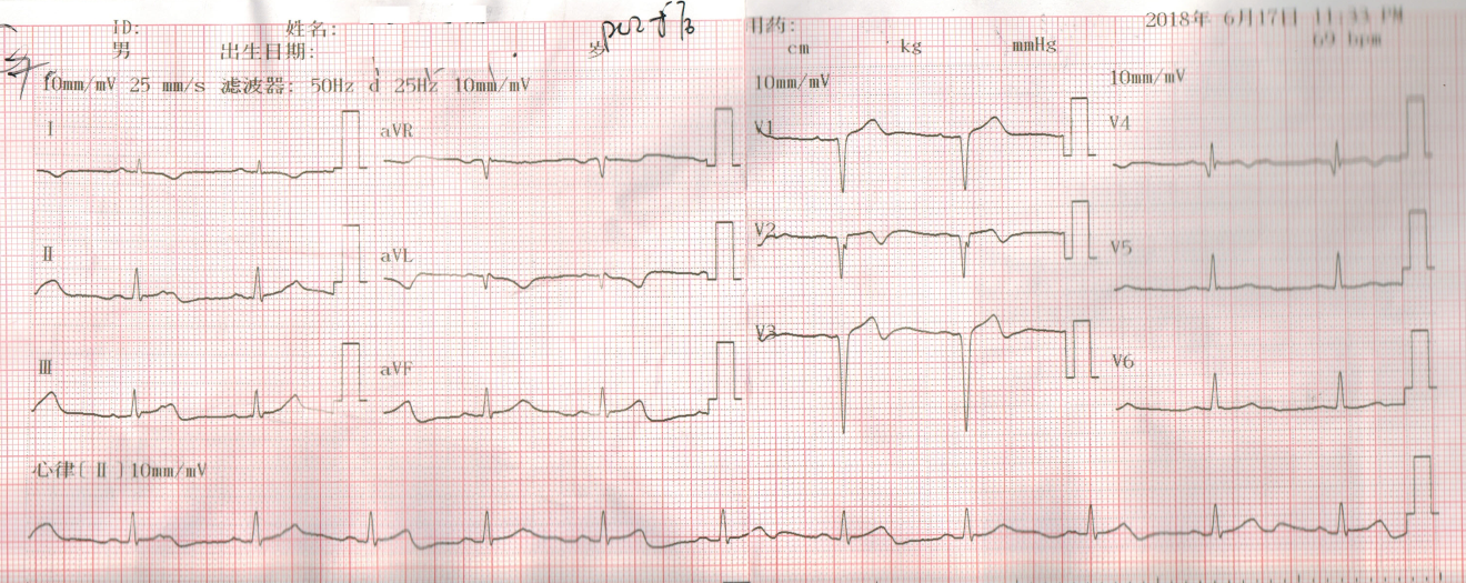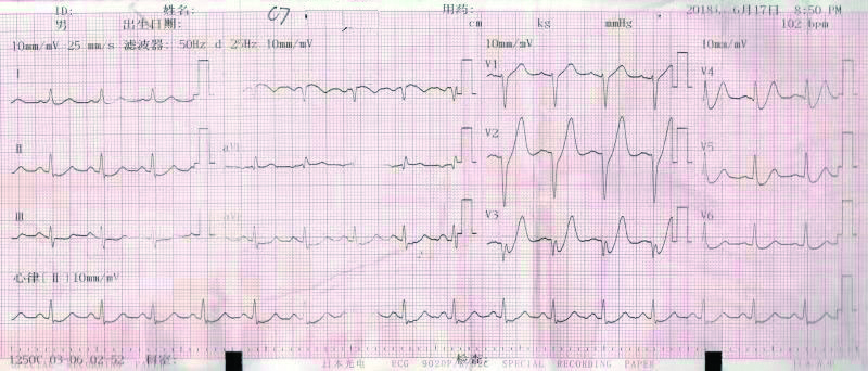 1 资料与方法 1.1 一般资料 纳入2018年1月至8月因急性胸痛(发病7 d内)在海南省人民医院心内科住院,心电图诊断为De winter综合征的患者7例,均为男性患者,年龄(52.5±13.0)岁,均无糖尿病、高血压及冠心病家族史,2例合并高脂血症,3例有吸烟史,见表 1。7例患者的临床表现情况见表 2。本研究符合医学伦理学标准,治疗及检查均获得患者或家属知情同意。7例患者均以胸痛入院,发病时间、伴随症状、入院生命体征及GRACE评分,见表 2。入院后心肌酶、肌钙蛋白T及血清钾等化验指标结果,见表 3。