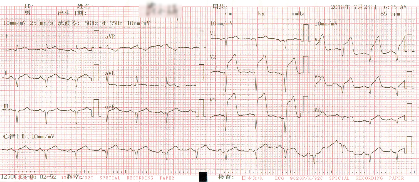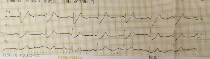 De winter综合征的主要心电图改变为:胸前V1-V6导联ST段呈上斜型下移,T波对称高尖,多数患者aVR导联ST段轻度上抬。出现这种心电图改变的原因尚未清楚。传统观点认为ST段压低,是因为心肌细胞受损后,由于不能正常除、复极,导致正常与异常心肌细胞之间产生电位差,出现损伤电流,导致ST段出现了相对或直接偏移。近年来,有人提出离子流学说,正常时Ito电流分布为外膜>内膜,当心内膜心肌缺血时,内膜Ito电流明显增大,达到钙失活电位后,造成二相平台丢失,内外膜之间形成的电位差由高到低指向心内膜,背离探查电极,从而引起ST段压低[5]。刘元生[6]则认为,前壁导联ST段未抬高,可能与细胞膜上ATP敏感性钾通道(KATP)不能激活有关,其机制是心肌缺血使ATP产生缺乏。也有学者推测可能是反复心肌缺血,及各冠脉之间已形成广泛的侧支循环所致[7]。