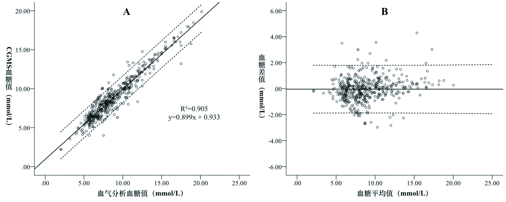 图 1 465对CGMS血糖值与血气分析血糖值的散点图(A)和Bland-Altman检验(B) |
