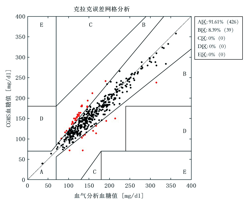 图 2 465对CGMS血糖值与血气分析血糖值的克拉克误差网格分析 |