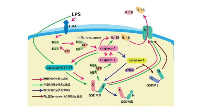 1.2.2 非经典炎症小体焦亡途径LPS也可以绕过TLR4直接结合并激活小鼠的caspase-11,激活后的caspase-11切割GSDMD使其激活并使细胞进入焦亡过程,称为非经典的焦亡途径。值得注意的是,非经典途径中激活的GSDMD亦可以激活炎症小体NLRP3,从而通过经典炎症小体途径活化caspase-1,加工IL-1β和IL-18前体,进入经典的焦亡过程[11]。这种途径在人体细胞体外培养时同样可以观测到[12]。