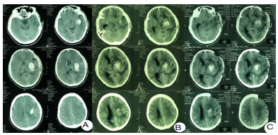 A:第1天,神志清楚遵嘱;B:第23天,脑疝;C:第23天,开颅左侧去骨瓣术后,脑缺血进一步加重 图 1 患者高血压自发性脑出血CT结果 |