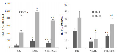2.5 肺泡灌洗液中炎症因子水平选取机械通气4 h的动物组为模型组,体内给予VILI大鼠C21(1 mg/kg)预处理,结果表明,通气4 h模型组BALF中促炎因子水平TNF-α、IL水平显著升高,抗炎因子IL-4、IL-10水平显著降低(P < 0.01)。而给予C21预处理组,可显著降低BALF中促炎因子水平TNF-α、IL-1水平, 升高BALF中抗炎因子IL-4、IL-10水平,与模型组相比差异具有统计学意义(P < 0.01)。见图 2。