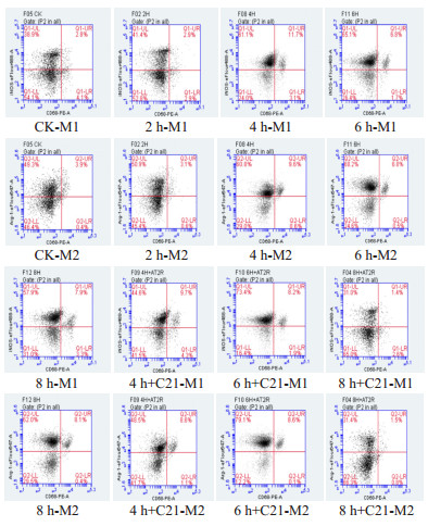 2 h和4 h模型组中M1/M2比值较对照组显著升高,4 h模型组M1/M2比值最高,说明造模后2~4 h巨噬细胞先向M1型极化,并在4 h达到峰值;6 h和8 h组的M1/M2比值也高于对照组,但与4 h组相比随时间延长而变小,与对照组相比差异有统计学意义(P < 0.01)。4、6、8 h模型预先给予AT2R激动剂C21干预后,其M1/M2比值较未给予AT2R激动剂C21的4、6、8 h模型组均降低,其中4 h组差异有统计学意义(P < 0.05),提示AT2R激动剂C21可促进巨噬细胞向M2型极化。见图 3。