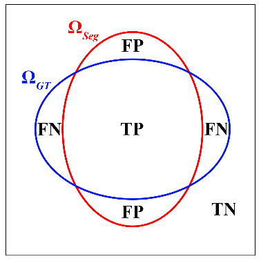 图 2 分割结果和金标准(GT)得到的两个区域ΩSeg(红色轮廓包围)和ΩGT(蓝色轮廓包围)的示意图 |
