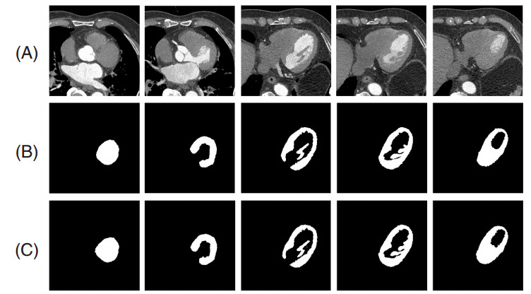 心血管疾病严重威胁着人类的健康,具有高患病率、高致残率和高病死率的特点[1]。其早期的诊断与治疗有助于改善心脏的功能和患者的预后,降低患者的病死率。左心室(left ventricle,LV)的准确分割是量化心室容积、射血分数、左心室质量、壁增厚以及壁运动异常等临床指标以定量分析心脏整体和局部的功能,进而诊断和治疗心血管疾病的关键步骤[2]。心脏CT血管造影术(cardiac CT angiography,CCTA)由于无创、操作简便,已经成为临床上一种重要的诊断方法[3]。然而,由于心脏CT图像中左心室区域与背景区域对比不明显、存在噪声等影响,使得左心室分割存在一定的难度。左心室的手动分割既费时又费力,其准确的分割依赖于有经验的操作者,否则易受操作者主观性影响,增加误诊率。计算机辅助诊断(computer aided diagnosis,CAD)系统可提供一种更准确、更客观的自动高效的辅助诊断方式,其中,左心室的分割是设计用于诊断心血管疾病的医学CT图像CAD系统的重要步骤。因此,左心室的分割方法研究具有重要的科学意义和应用价值。