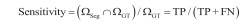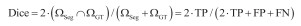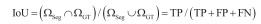 1.4 分割评估指标本文采用Dice系数、IoU系数、精确度(precision)及灵敏度(Sensitivity)四项指标评估分割结果与金标准(GT)之间的一致性。如图 2所示,ΩSeg表示分割得到的目标区域,等于TP + FP;ΩGT表示标准的目标区域,等于TP + FN。其中,TP表示正确分割为正类的像素数,TN表示正确分割为负类的像素数,FP表示错误分割为正类的像素数,FN表示错误分割为负类的像素数。Dice系数[式(1)]和Iou系数[式(2)]度量了分割得到的目标区域与标准的目标区域的空间重合度,精确度(precision)[式(3)]度量了分割得到的目标区域中实际为正类像素的比例,灵敏度(sensitivity)[式(4)]度量了标准的目标区域中被正确分割的比例。四项指标评估值都在0到1之间,值越大代表ΩSeg与ΩGT之间的一致性越高,分割结果越好。