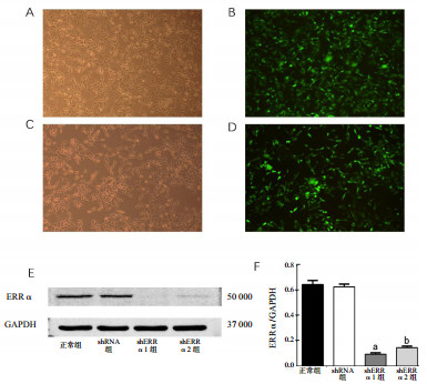 2 结果 2.1 PMVECs感染效率正常大鼠PMVECs形态呈梭形或多边形(图 1A、C),以MOI=10感染PMVECs细胞,荧光显微镜下观察绿色荧光蛋白的表达量(图 1B、D),发现shERRα1组(图 1A、B)及shERRα 2组(图 1C、D)绿色荧光蛋白表达量均大于80%。运用Western Blot检测ERRα的表达量,与正常组及shRNA组比较,shERRα1组及shERRα2组ERRα的表达量均明显下降,shERRα1组下降更为明显(图 1E、F)。