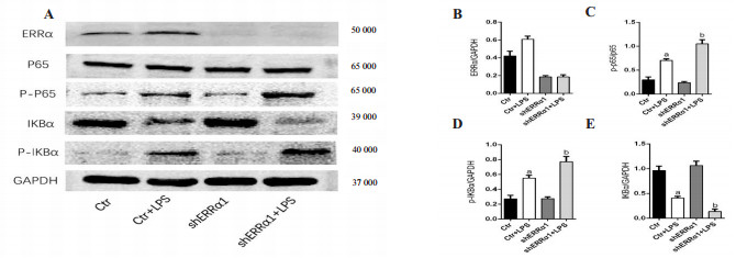 | 注:与Ctr及shERRα1组比较,a P < 0.05;与Ctr+LPS组比较,b P < 0.05 | ||||||||