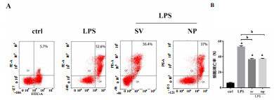 LPS处理内皮细胞24 h后,应用流式细胞仪检测凋亡情况,结果显示,较对照组,LPS组凋亡细胞数百分比从5.7%±1.1%增加到52.6%±1.6%(图 1A),而SV组与NP组能够减轻由LPS所引起的细胞凋亡,差异有统计学意义;但两组间差异无统计学意义(图 1B)。
