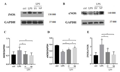 LPS处理HUVEC细胞,脓毒症细胞模型造模。用SV及NP处理细胞后,提取细胞蛋白,Western bolt法检测iNOS和eNOS含量。结果发现LPS刺激后,iNOS表达明显升高,辛伐他汀处理后可下调HUVEC中iNOS的表达,NP组较SV组存在iNOS水平水平的改善,但组间差异无统计学意义,eNOS在LPS刺激后表达则显著降低,辛伐他汀可恢复eNOS在HUVEC中的表达,NP组对于eNOS的恢复效应要明显高于SV组,组间差异有统计学意义;iNOS/eNOS比值在LPS组显著升高,不同剂型辛伐他汀处理后明显降低,均有统计学意义,而在SV组和NP组间差异无统计学意义。见图 3