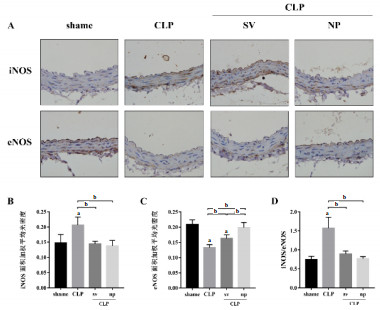 免疫组化结果(图 4)显示,与假手术组(shame)相比,CLP组eNOS蛋白的半定量表达明显降低(图 4AC),而iNOS的半定量表达明显增高;SV和NP均有提高eNOS蛋白水平的效应,且NP较SV更有助于eNOS浓度的改善,差异有统计学意义;SV组和NP组中iNOS水平较CLP组逐渐下降,差异有统计学意义,SV组和NP组之间趋势有降低表现,差异无统计学意义;iNOS/eNOS的比值在CLP组显著升高,不同剂型辛伐他汀处理后明显降低,差异均有统计学意义,而在S V组和NP组间差异无统计学意义。