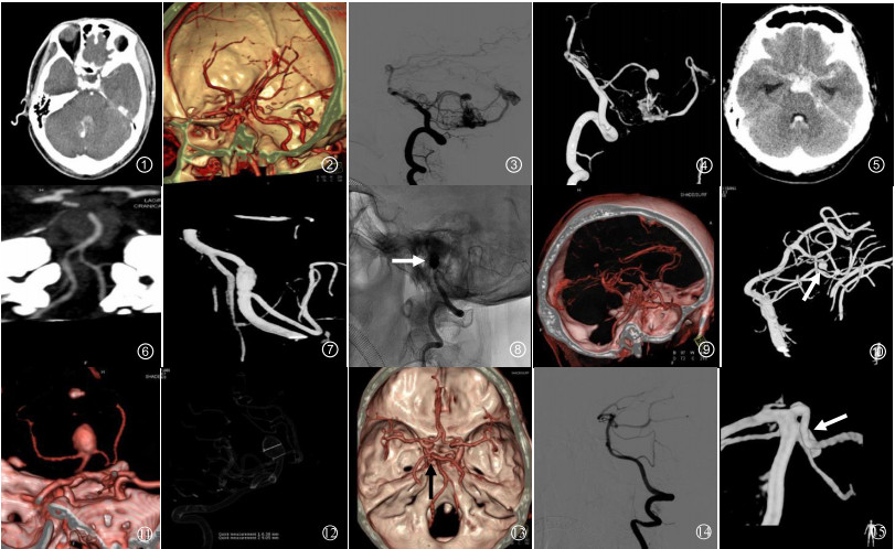 图 1 图 1~4 病例1:男,40岁,突发头痛伴呕吐1 d余。CTA原始轴位图像(图 1)示第四脑室后方囊袋状对比剂充盈影,周围见高密度出血,结合3D-CTA VR图像(图 2)考虑右侧小脑前下动脉出血性动脉瘤。2D-DSA及3D-DSA均可见动脉期有静脉早显现象,小脑前下动脉囊状动脉瘤的后方伴有畸形血管团和增粗的引流静脉,提示小脑动静脉畸形合并小脑前下动脉动脉瘤形成(图 3~4) 图 5~8 病例2:男,48岁,突发剧烈头痛、呕吐1 d。查头颅CT提示SAH、脑室积血(图 5)。MIP图像见左侧椎动脉颅内段局部血管痉挛改变,未见明确动脉瘤(图 6)。DSA显示左侧椎动脉V4段(小脑后下动脉分叉处以远)串珠征及双腔征改变,提示夹层动脉瘤(图 7 3D-DSA;图 8急诊栓塞后DSA,白箭头示弹簧圈) 图 9~10 病例3:女,43岁,突发头疼2 d。自发性SAH患者,3D-CTA检查均未见动脉瘤(图 9)。3D-DSA清晰可见左侧小脑上动脉远段分支小囊状染色,诊断为左侧小脑上动脉远段小动脉瘤破裂(图 10, 白箭头示) 图 11~12 病例4:男,58岁,突发头痛伴恶心、呕吐1 d。3D-CTA和3D-DSA均可清楚地显示基底动脉尖直径9 mm动脉瘤,并具有更直观的3D效果,真实显示了瘤体形态、瘤颈及动脉瘤与载瘤动脉的空间关系(图 11 CTA VR图像;图 12 DSA三维透明法) 图 13~15 病例5:女,54岁,突发意识障碍伴头痛、呕吐2 d。3D-CTA考虑左侧大脑后动脉起始部动脉瘤(图 13, 黑箭头示)。12 h后行常规DSA及3D-DSA检查(图 14~15)。因注入的对比剂量增加,对细节的显示更清楚,DSA准确显示动脉瘤位于左侧小脑上动脉近段(图 15, 白箭头示) |
