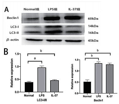 A:LC3I/Ⅱ和Beclin1蛋白条带;B:LC3I/Ⅱ和Beclin1表达统计结果。LC3I/Ⅱ蛋白:LPS组与Normal组比较, bP<0.01;IL-37组与Normal组比较, aP<0.05;Beclin1蛋白:LPS组与Normal组比较, bP<0.01;IL-37组与Normal组比较, bP<0.01 图 1 Western blot检测Treg自噬相关蛋白表达 Fig 1 Expressions of autophagy-associated proteins in Treg by Western blot |