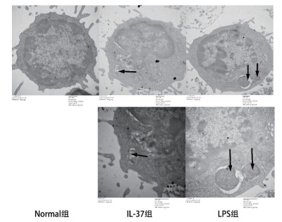 IL-37刺激体外培养Treg(100 ng/mL,24 h),检测Treg中自噬相关蛋白Beclin1和LC3表达发现,LPS刺激下Treg自噬活性明显增强(P<0.01);与Normal组比较,IL-37刺激后Treg内自噬活性增加(P<0.05,图 1)。透射电镜结果显示:IL-37刺激Treg后自噬小体的形成明显增多,表明IL-37可以上调Treg内自噬活性(图 2)。
