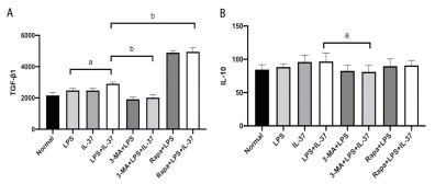 在LPS暴露下予以IL-37刺激Treg,发现Treg培养上清液中TGF-β1分泌水平显著增加(P<0.05),而3-MA+LPS+IL-37组TGF-β1水平较LPS+IL-37组明显下降(P<0.01),与LPS+IL-37组比较,雷帕霉素+LPS+IL-37组TGF-β1表达明显升高(P<0.01,图 3A)。与LPS+IL-37组比较,仅3-MA+LPS+IL-37组IL-10水平出现下降(P<0.05),而雷帕霉素+LPS+IL-37组IL-10分泌水平与LPS+IL-37组比较并差异无统计学意义(P > 0.05),表明IL-37以自噬依赖的途径调节Treg分泌功能(图 3B)。