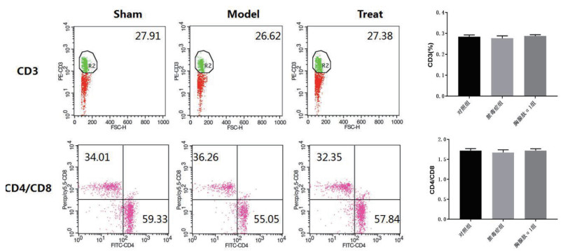 sham空白对照组;model脓毒症组;Treat胸腺肽组 图 1 小鼠血浆T淋巴细胞流式细胞分析。 Fig 1 Flow cytometric analysis of T lymphocytes in mice |