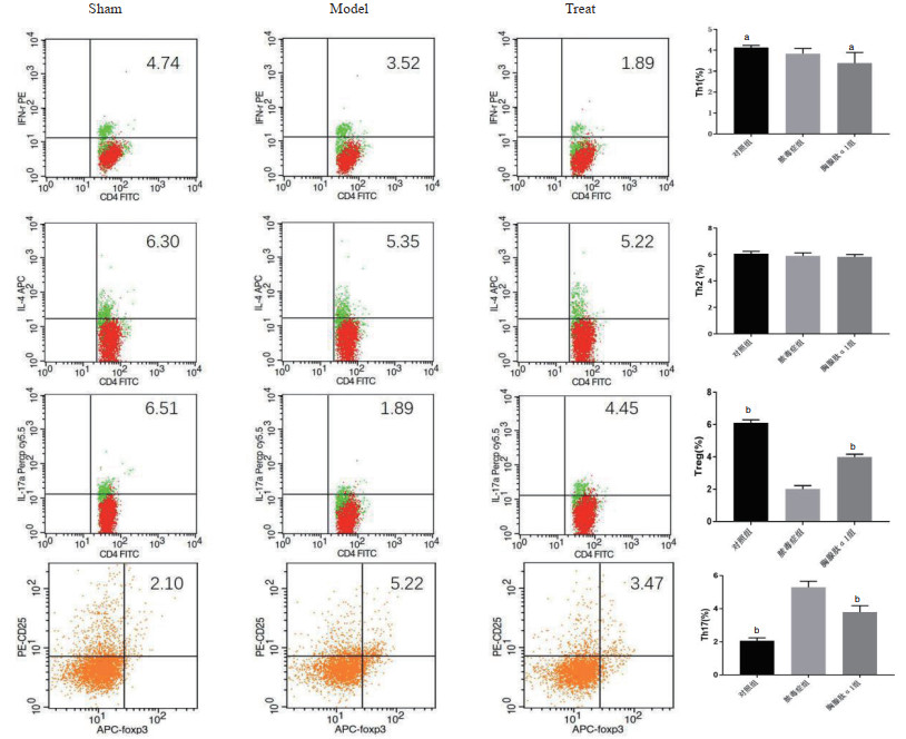 sham:空白对照组;model:脓毒症组;Treat:胸腺肽组(aP<0.05;bP<0.01) 图 2 小鼠血浆T细胞分化流式分析 Fig 2 Flow cytometric analysis of T lymphocyte differentiation in mice |