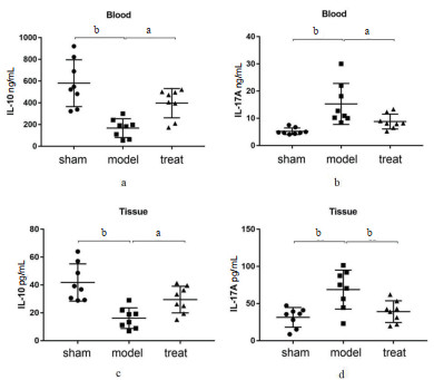 sham空白对照组;model脓毒症组;Treat胸腺肽组;blood血浆;Tissue肺组织(上横线为最大值,下横线为最小值,中间横线为均值,aP<0.05;bP<0.01) 图 3 小鼠血浆、肺组织中IL-10、IL-17(Elisa)。 Fig 3 Determination of IL-10 and IL-17 in mice (Elisa) |