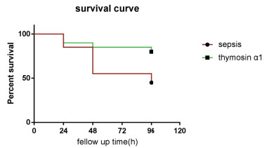 LPS诱导的脓毒症大鼠的存活率在使用胸腺肽α1后得到改善。对Kruskal-Wallis生存曲线进行Log-rank检验结果胸腺肽α1治疗组(n=10)生存率明显高于LPS诱导脓毒症组(n=10)(P = 0.029)。Survival curve生存曲线;Percent survival生存率;Fellow up time随访时间;Sepsis脓毒症;Thymosin α1. 图 4 小鼠生存曲线 Fig 4 Survival curve of mice |
