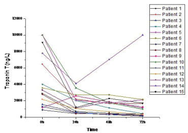 图 1 15例存活患者72 h内肌钙蛋白T变化情况 Fig 1 The change of troponin T within 72 h in 15 survival |