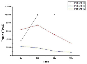 图 2 3例死亡患者72 h内肌钙蛋白T变化情况 Fig 2 The change of troponin T within 72 h in 3 non-survival patients |