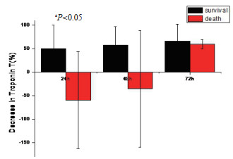 图 3 存活组与死亡组之间肌钙蛋白T下降率的比较 Fig 3 The decrease rate of troponin T between the survival group and non-survival group |