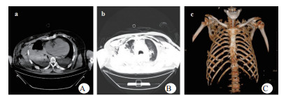 图 1 A胸部CT纵隔窗(右侧胸壁塌陷);B胸部CT肺窗(广泛皮下积气,肺挫伤);C肋骨三维重建(多根多处肋骨骨折)。 |