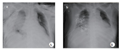 图 2 A入院第一天床边胸片;B术后当天床边胸片。 |