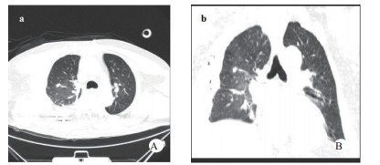图 3 A撤离ECMO第一天胸部CT;B撤离ECMO第一天胸部CT立体成像。 |