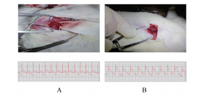 | A:手术前心电图示ST段正常; B:手术后心电图示ST段明显抬高 图 1 心电图显示心肌缺血情况 Fig 1 ECG show myocardial ischemia |