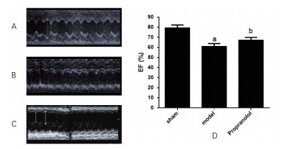 | A:sham组超声心动图。B:model组超声心动图。C:Propranolol组超声心动图。D:各组心脏EF值差异。与sham组比较aP<0.05;与model组比较bP<0.05 图 2 超声心动图评价心功能 Fig 2 Echocardiographic evaluation of cardiac function |