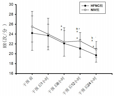 干预后各时间点与同组干预前比较,aP<0.05;同一时间点两组间比较,bP<0.05; 图 2 两组患者干预前后呼吸频率变化 |