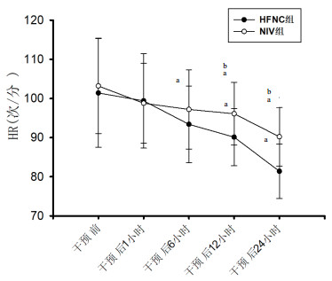干预后各时间点与同组干预前比较,aP<0.05;同一时间点两组间比较,bP<0.05; 图 3 两组患者干预前后心率变化 |