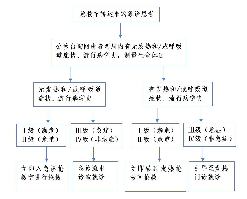 3 改进流程 3.1 普通急诊区域发热及呼吸道症状的筛查及预检分诊:急诊在急诊入口处设置快速体温监测和预检分诊,对所有出入人员进行体温检测,询问流行病学史,如有发热和(或)呼吸道症状,或流行病学接触史等上述之一的情况则引导到发热门诊就诊,如无上述情况则到急诊分诊台进行二次分诊。急诊分诊台再次询问患者的症状及流行病学史,测量生命体征,如初步判断患者不符合新型冠状病毒肺炎筛查指征,则安排在急诊区域就诊,如有发热和/或呼吸道症状,或有流行病学接触史,则转到发热门诊就诊。急诊诊室接诊医生会继续询问患者的症状及流行病学史,如发现有可疑的流行病学史或症状无法排除新冠肺炎则转到发热门诊就诊。