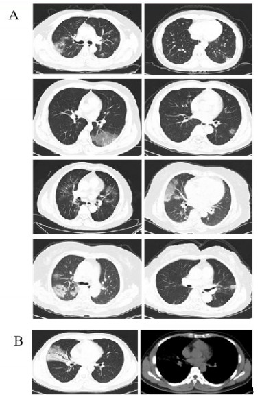 A:8例患者在就诊时胸部CT可见磨玻璃影;B:1例患者就诊时胸部CT表现为实变影 图 1 新型冠状病毒感染患者胸部CT表现 Fig 1 The image characteristics of novel coronavirus infection patients |