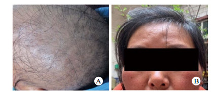 A:4号患者2010年发病时头发;B:4号患者2019年随访时头发 图 1 4号患者头发脱落及生长对比 Fig 1 Comparison of hair loss and growth in No.4 patient |