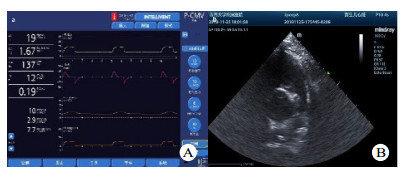 A:为瑞士HAMILTON·G5呼吸机;B:肺动脉漂浮导管位置 图 1 本实验所用呼吸机及心脏超声机 Fig 1 Ventilator and echocardiography used in this experiment |