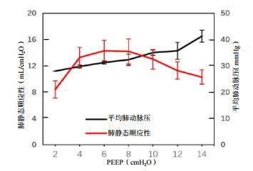 1.3 实验实施 1.3.1 调整PEEP保持控制压力、呼吸频率、吸入氧体积分数不变,将PEEP逐步调至2、4、6、8、10、12、14 cmH2O,每次调整均保持通气参数固定30 min,待比格犬各项监测指标平稳后,记录在此过程中呼吸力学及血流动力学、右心功能监测指标,结束后恢复基础通气模式1 h,待犬生命体征平稳后制备模型。