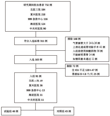 2 结果 2.1 入组情况及干预方法 2.1.1 入组情况、人口学与基线指标2017年10月至2018年3月五家研究中心综合ICU共收治患者732例,最终入组91例,随机(随机数字法)分为试验组46人,对照组45例(图 1),两组患者人口学参数、APACHE Ⅱ评分、第1天SOFA评分、来源科室及基础疾病均差异无统计学意义(表 1)。