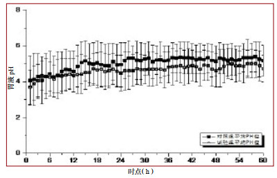 2.2 胃液相关指标 2.2.1胃液pH值监测情况两组胃液pH值总体变化趋势一致,第一个24 h内两组pH值较为接近,此后对照组pH值水平始终高于试验组,并在第四个24 h后两组pH值曲线更趋接近(图 2)。