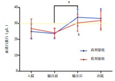 aP < 0.05(治疗前vs治疗后); bP < 0.05(低剂量组vs高剂量组) 图 1 入ICU后血清白蛋白变化曲线图 |