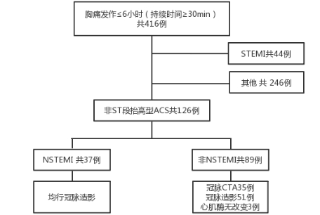 1 资料与方法 1.1 一般资料回顾性分析2018年1月至2019年5月江苏省中医药研究院急诊科抢救室收治发病6 h内的胸痛患者,共416例。入选存在冠心病高危因素且心电图有心肌缺血表现的患者,排除标准:①STEMI;②初始cTnT > 30 pg/mL;③新发完全性左束支传导阻滞;④急性心包炎;⑤主动脉夹层;⑥肺栓塞;⑦肺部感染、肿瘤、结核、气胸;⑧胸廓疾病;⑨资料不完整的患者,共290例;符合纳入患者126例,其中37例患者在院内通过冠脉造影明确诊断为NSTEMI。89例为非NSTEMI,其中35例行冠脉CTA、51例行冠脉造影明确,3例患者因经济及自身原因拒绝进一步检查,通过监测心肌标志物排除心肌梗死。患者纳入流程图见图 1。