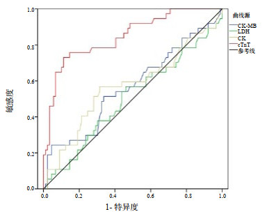 应用ROC曲线对心肌标志物进行诊断价值的分析,结果显示,在非ST段抬高型ACS中cTnT曲线下面积明显高于其他指标,其AUC为0.846,对应cTnT的界值为11.35 pg/mL,其敏感度为0.730,特异度为0.888,阳性预测值(PPV)72.97%,阴性预测值(NPV)87.64%,见表 3和图 2。