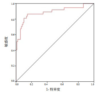 通过二分类Logistic回归模型,用年龄、性别、是否吸烟、高血压、cTnT、BNP、CK-MB、LDH、糖尿病等危险因素分析对NSTEMI的影响。最终模型纳入了cTnT、年龄、糖尿病、BNP四个变量具有统计学意义(表 4)。该Logistic回归模型提示,这四个变量可以预测患者是否为NSTEMI。最终,得到的Logistic模型具有统计学意义,χ2(4)=64.079,P < 0.01。模型的敏感度为0.690,特异度为0.944,阳性预测值为82.76%,阴性预测值为96.55%。在SPSS中绘出ROC曲线,获得ROC曲线下面积,其AUC为0.886(图 3)。