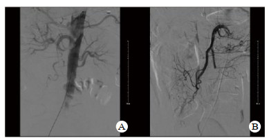 图 1 患者术前术后肠系膜上动脉造影结果(A:介入治疗术前造影提示肠系膜上动脉闭塞;B:介入治疗术后造影提示肠系膜上动脉开通) |