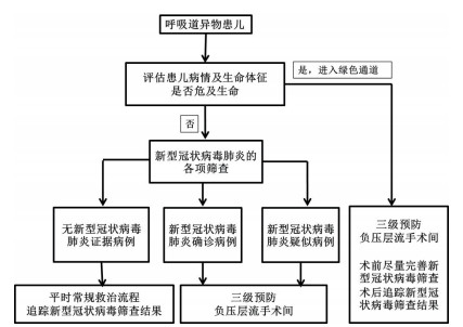1 急诊分诊(1)耳鼻咽喉科医生评估患儿呼吸情况,不迅速危及生命的相对平稳的呼吸道异物患儿,需常规完善胸部CT,病毒核酸检测,血常规等对于新型冠状病毒肺炎的各项筛查。及时启动院内专家会诊,根据《新型冠状病毒感染的肺炎诊疗方案(试行第五版)》的诊断标准对需行呼吸道异物外科急诊手术的患者进行诊断,将拟手术患者分为确诊的新型冠状病毒肺炎患者、疑似的新型冠状病毒肺炎患者(将无法明确排除新型冠状病毒肺炎可能的发热患者、确诊患者的密切接触者也按疑似患者处理)和无明确流行病学史且无明显新型冠状病毒肺炎临床表现的患者(含已排除)来分类进行处理。
