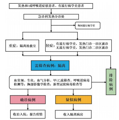 图 1 四川大学华西医院发热门诊新型冠状病毒肺炎筛查流程 Fig 1 Screening process of COVID-19 in the Fever Clinic of West China Hospital |