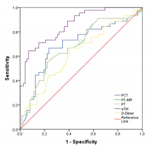 对119例脓毒症患者进行ROC曲线分析,以内皮细胞损伤指标(sTM、t-PAI-C)、凝血纤溶指标 (PLT、FDP、AT-Ⅲ、TAT、PIC、PT、PT-INR、FIB、D-Dimer)、炎症指标(WBC、NEU#、PCT)设为ROC曲线的检验变量,将发生AKI设为状态变量。sTM、PCT、PT、PT-INR、D-Dimer的曲线下面积依次为:0.857(0.790, 0.924),0.691(0.587, 0.794),0.690(0.590, 0.789),0.688(0.588, 0.787),0.609(0.504, 0.715),其中sTM的诊断阈值为29.975 TU/mL,诊断灵敏度和特异度分别为0.644、0.918(见表 3、图 1)。